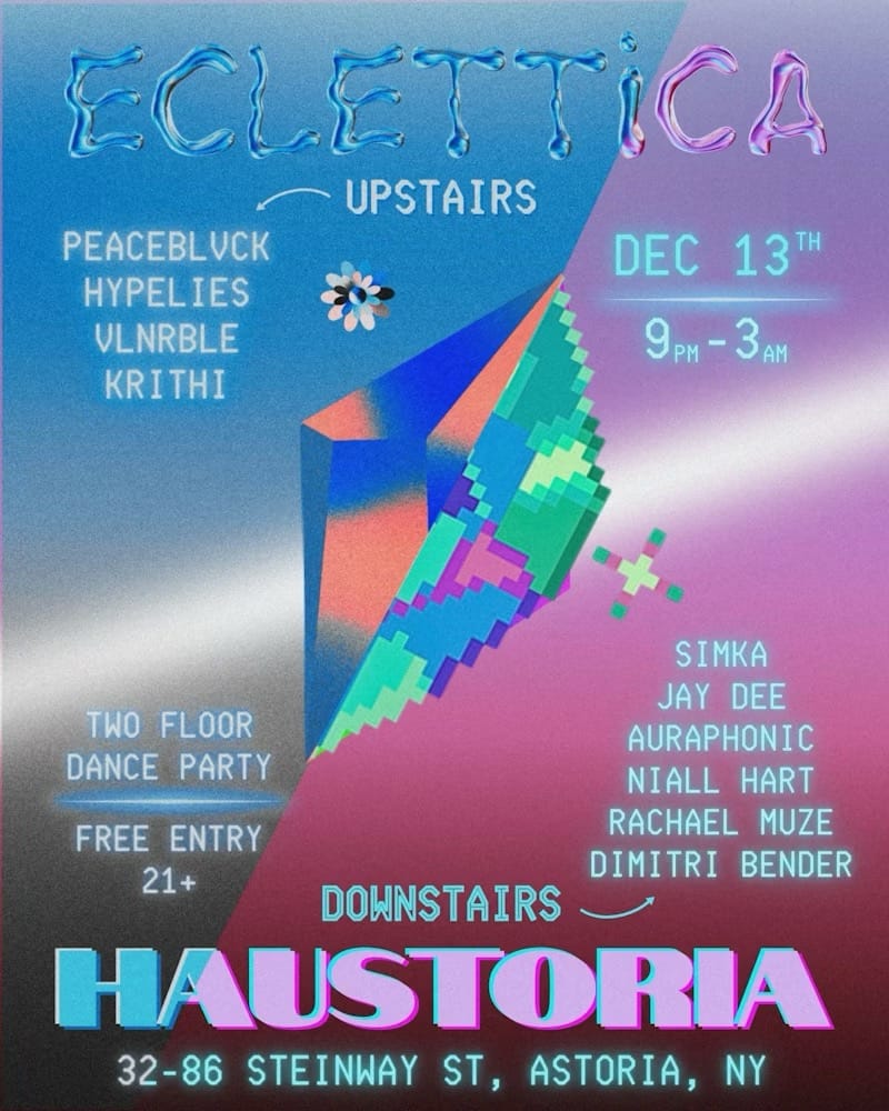 HAUSTORIA, the longtime Astoria partystarters, and ECLETTICA, an up-and-coming event series, are taking over LIC Tonsorial and transforming it into a free ravespace. This epic party will feature 2-floors and 10 DJs playing a wide variety of genres, from house to techno to breakbeats and global dance tracks. I am particularly looking forward to sets by Peaceblvck and Krithi. Luckily, due to the organizer's attention to detail, set times will be staggered so you can see everyone.